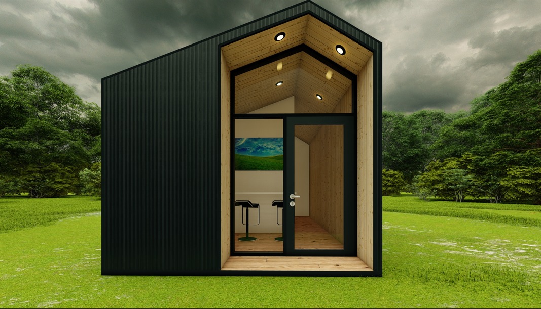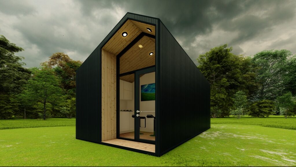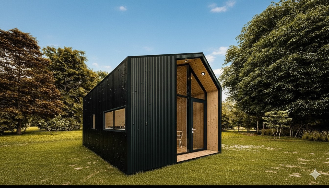 Tiny House metálica de 18 m² con revestimiento exterior y diseño moderno