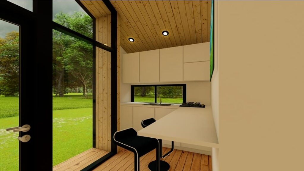 La Tiny House tiene una superficie total de 18 m², optimizada para ofrecer comodidad, funcionalidad y un buen aprovechamiento de cada espacio interior.