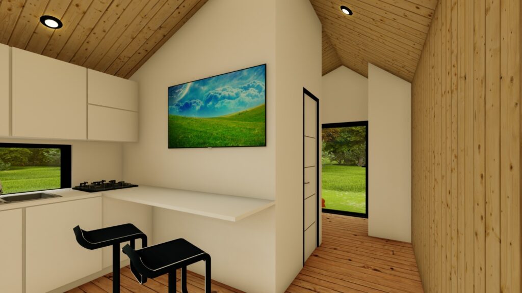 El modelo base de nuestra Tiny House de 18 m² incluye cocina semi amoblada con encimera tipo comedor diario, baño completo con showerdoor, WC y lavamanos, y dormitorio matrimonial con clóset. Todo está diseñado para un uso habitacional inmediato.